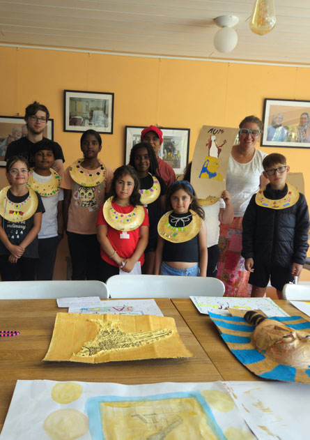 In der ersten Sommerferienwoche reisten die Kinder mit der Künstlerin Dr. Doaa Elsayed kreativ ins Alte Ägypten. Nach einem spannenden Einstieg mit Film und Geschichten wurden Mini-Pyramiden gebaut, „Papyrus“ aus Altpapier hergestellt und Namen in Hieroglyphen geschrieben. Aus Recyclingmaterialien entstanden fantasievolle 3D-Kunstwerke, kleine Skarabäen und bemalte Uschebtis, die Grab-Beigaben der alten Pharaonen. Ein Ferienprojekt mit viel Farbe, Fantasie und Freude – das am Freitag zum Abschluss vor den Eltern und Gästen des Cafés stolz präsentiert wurde. Ein Highlight waren auch die prachtvollen ägyptischen Kragen, welche die Kinder mit viel Liebe zum Detail bastelten und stolz zur Abschlusspräsentation trugen. Dabei stellten sie jeweils eine ägyptische Gottheit vor, die sie selbst ausgewählt, gemalt und in kurzen Texten beschrieben hatten.. „Mein Kind war begeistert! Es hat jeden Tag etwas Neues erzählt – und zu Hause weitergebastelt“, berichtet ein Vater, dessen beide Kinder zum ersten Mal an einem solchen Workshop teilgenommen haben.