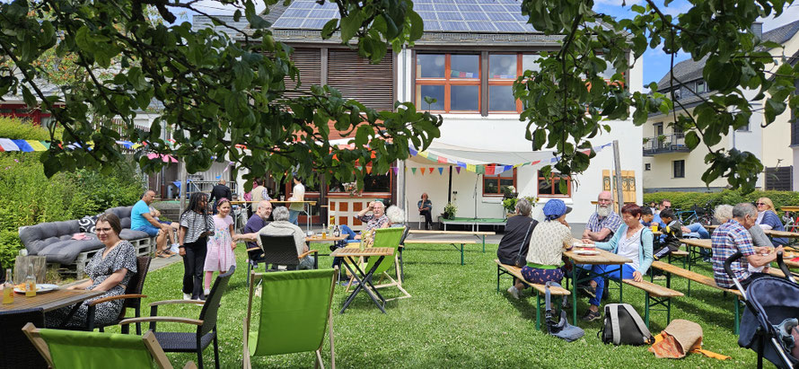Ein besonderer Höhepunkt war der über offenem Feuer gekochte Plov (Pilav), zubereitet von einem ukrainischen Gast, der das Café regelmäßig zum Deutschlernen besucht und sonst in Oberwesel berufstätig ist. Zusätzlich wurde in der Küche des Gemeindehauses gemeinsam eine bunte Vielfalt an Speisen aus Afghanistan, Syrien, Somalia und der Türkei zubereitet oder auch mitgebracht von anderen Engagierten aus Kastellaun bis Kirchberg, die sich alle dem Café zugehörig fühlen. Café-Koordinatorin Okka Senst. betont, wie wichtig solche finanzielle Förderungen für die inhaltliche Weiterentwicklung des Cafés sind: „Viele unserer Ehrenamtlichen sind berufstätig. Damit wir sie entlasten und gleichzeitig das Angebot erweitern können – besonders auch tagsüber – suchen wir kontinuierlich nach mehr Unterstützung.“Pfarrerin Sandra Menzel nutzte den Tag der Nachbarschaft auf ihre Weise: Sie nahm sich bewusst Zeit, um mit einzelnen – vor allem älteren – Gemeindemitgliedern ins Gespräch zu kommen und Gemeinschaft am Tisch zu leben. Elisabeth Härter aus Büchenbeuren, die mehrmals wöchentlich mit ihrer ukrainischen Pflegekraft das Begegnungscafé besucht , freut sich wie viele der älteren Gäste über jedes neue Angebot: „Zum Glück ist es nicht immer so turbulent wie heute – aber genau das macht solche Tage besonders.“