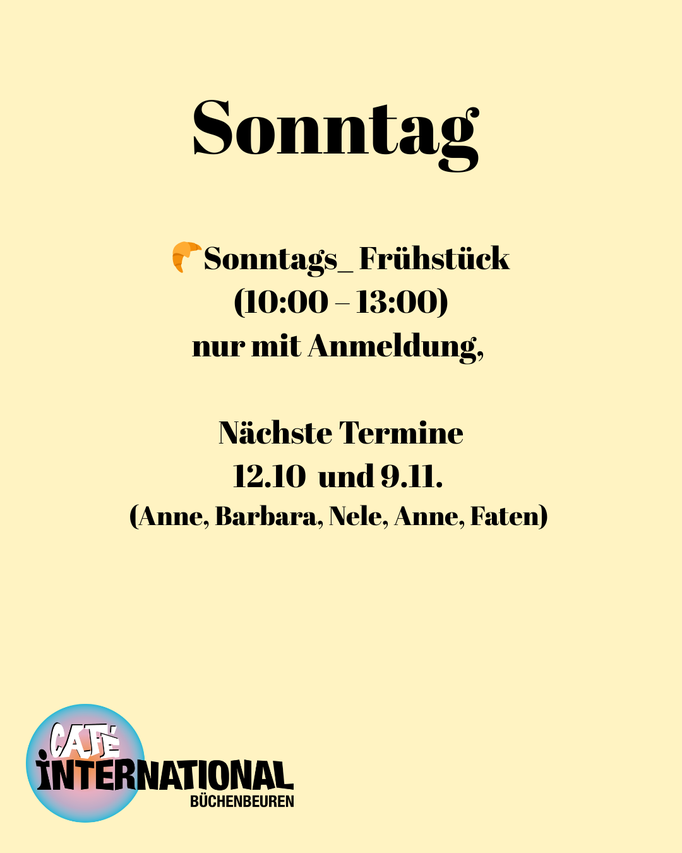 Unser beliebtes Sonntagsfrühstück wird am 9.11. als Sonntagsbrunch (gegen solidarische Spende) und wieder als besonderes Erlebnis am Heiligabend, 24.12. als Mitbringfrühstück stattfinden. Wir bitten auch hierfür um Anmeldung.